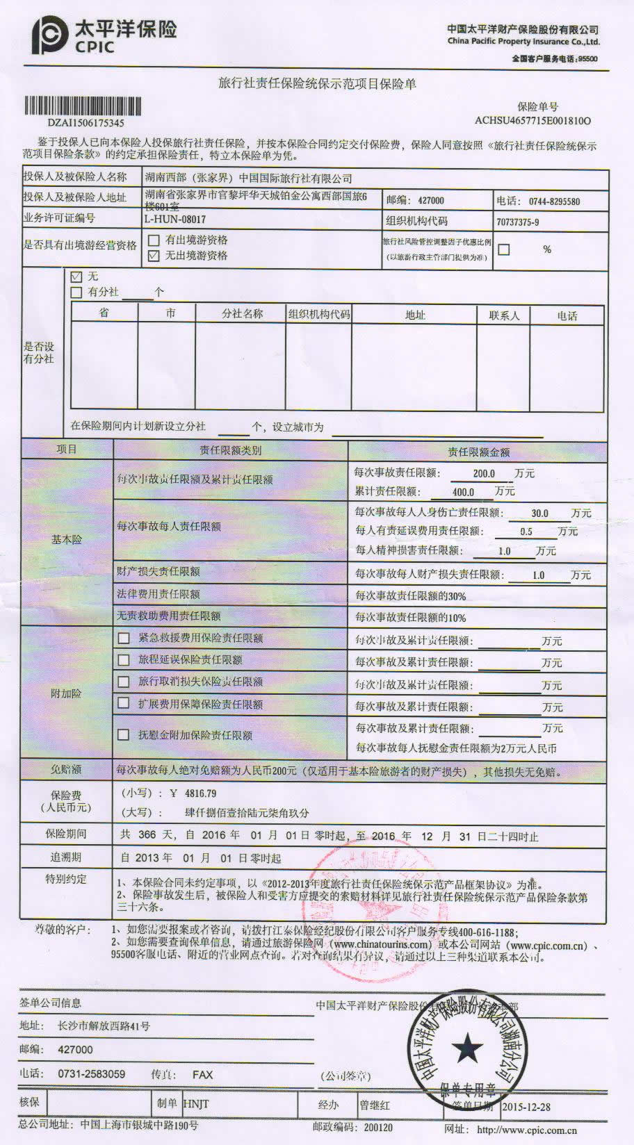 旅行社保險單