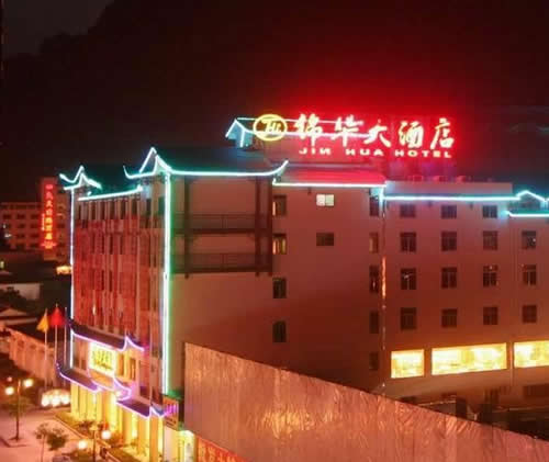 武陵源錦華大酒店是一家按國(guó)家四星級(jí)標(biāo)準(zhǔn)、2009年5月新修建成的豪華旅游度假酒店,地理位置優(yōu)越,位于武陵源汽車(chē)站旁.酒店集觀光旅游、度假、商務(wù)會(huì)議、品嘗土家美食等多功能為一體,酒店建筑融合張家界地區(qū)的民族風(fēng)情和建筑文化,是張家界地區(qū)最有土家風(fēng)情的星級(jí)酒店之一。 武陵源錦華大酒店安裝了數(shù)控中央空調(diào)系統(tǒng)、空氣源熱水系統(tǒng)。24小時(shí)供應(yīng)冷熱水。 武陵源錦華大酒店擁有客房100間,其中套房3間、標(biāo)準(zhǔn)間96間、單人間1間,客房?jī)?nèi)配有液晶電視、閉路電視和寬帶接口;餐要包廂8個(gè)、豪華包相一個(gè)、極具當(dāng)?shù)靥厣摹盎鹂游荨卑鼛?個(gè)、中餐宴會(huì)廳可同時(shí)容納300人就餐。酒店還配備一個(gè)高標(biāo)準(zhǔn)多功能的現(xiàn)代化會(huì)議室,安裝有電視電話會(huì)議系統(tǒng),可以舉行各種類(lèi)型的中小型會(huì)議。