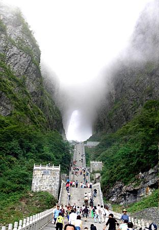 這里的山路99道彎 在懸空了二十四分鐘經(jīng)歷了奇險的8座山峰后,我們的心終于才踏踏實實的落到了地面上,到達了山頂。 山下晴朗山上雨。 乘坐在環(huán)保汽車上,透過車窗所能見到的似黛似玉的畫屏與絕壁千仞的壯觀;所能感受到的是蕩氣回腸的奇絕與如詩如畫的震撼。窗外仍然細雨蒙蒙,環(huán)保汽車繼續(xù)回旋在通天大道的彎道上,突然前面看不到公路的延伸,但車還在原速行駛,讓人多少有點害怕,誰知,在一個180度急轉(zhuǎn)彎后,環(huán)保車依然行駛在懸于半空的通天大道上,安然無恙。這大致就是通天大道的“絕”了,明明無路可走,誰知卻從一個讓你無法想象的角度把你的視線續(xù)接起來;赝幌拢媸切U有意境,象一條巨龍,攀附在山體,蜿蜒而上。 在我還在驚奇“通天大道”蜿延峻巡于群山絕壁之上的絕險感嘆 “通天大道”艱苦建筑于壁立萬傾之中的奇?zhèn)r,思路便被同伴雀躍的歡呼拉回!翱吹教扉T洞了!”。 999級的上天梯,有清代俞良模的提詞:莫謂山高空仰止此中真有上天梯?磥硐胍上蛇真得經(jīng)歷一翻磨難的。做了幾個深呼吸,開始爬上天梯,天門洞已經(jīng)呈現(xiàn):南北對開,大約150米左右高、氣勢磅礴,巍峨高絕,有團團云霧自洞中吐納翻涌,瑰麗神奇,宛如幻境。大約2平方公里的山頂,視野廣闊,往下看去,山在云中動,云附山體游,飄飄然的,還真有點仙人的感覺。洞口的風很大,這雨形成一大塊的雨屏,跟隨洞口來風改變著方向,肆意刮著,落在臉上很舒服…… 天門山是一幅濃墨淡彩的山水水墨畫,需要你慢慢品味…… |