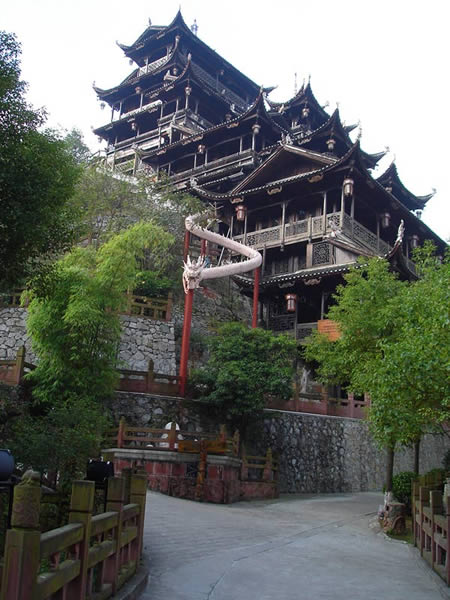九重天 九重天世襲堂是土家風(fēng)情園的精華和靈魂所在。該建筑由土家民間藝人李宏進(jìn)設(shè)計(jì),依80度陡坡而建,高48米,共9重12層,整個(gè)樓房全部用木栓連接,沒(méi)有一顆鐵釘,堪稱土家族建筑史上的奇跡。2002年9 月22日,九重天吊腳樓被載入世界吉尼斯世界紀(jì)錄,認(rèn)定其為目前中國(guó)最大、最高、最完美的木質(zhì)結(jié)構(gòu)吊腳樓。2001年4月6日,朱镕基總理視察土家風(fēng)情園時(shí),對(duì)九重天贊不絕口:“一批民間匠人能造出這樣輝煌的吊腳樓,而且還解決了力學(xué)的問(wèn)題,真是不簡(jiǎn)單。”清華大學(xué)著名建筑學(xué)家何重義先生說(shuō):“張家界土家風(fēng)情園完全可以和蘇州的園林相媲美。特別是九重天世襲堂,猶如玉宇瓊閣,令人神往!”古人說(shuō),天有九野,地有九州,土有九山,山有九寨。古人又把九重叫做天,說(shuō)天有九重,最上一重是上帝和君主居住的地方,所以我們叫它“九重天”。