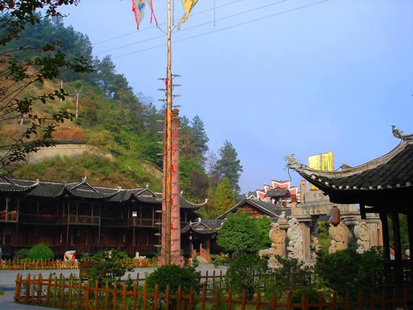 土司城 土司制度初建于五代十國(guó)時(shí)期,到了明朝己非常成熟了,土司王有無(wú)上的權(quán)威,在湘西有三大土司王分別是桑植土司向氏、永順土司王彭氏、慈利土司王張氏,其中又以永順溪州土司彭氏實(shí)力最強(qiáng)。其它土司王都為自己修建一座土司城,唯有彭氏分別在永定、永順修建了二座土司城。在永定的土司城內(nèi),彭氏為顯示其地位,修建了湘西最高的一座高達(dá) 48米,共12層的吊腳樓,整棟樓竟無(wú)一根鐵釘,堪稱土家吊腳樓建筑史上的奇跡,此樓于2002年9月被評(píng)為最高吊腳樓,榮獲世界吉尼斯之最,與此同時(shí)土司城內(nèi)舉辦一千人參加表演的毛古斯舞蹈活動(dòng)獲得圓滿成功,同時(shí)獲得世界吉尼斯之最。進(jìn)入土司城,首先看到土司城迎賓儀式,土家漢子迎賓鼓,吹牛角、放沖,土家姑娘攔門歌,敬攔門酒,進(jìn)入城內(nèi),在祭祀堂前舉行百人土家大祭祖活動(dòng),男女老少唱擺手歌、跳擺手舞,登世界最高的吊腳樓九重天,參觀土家族千百年來(lái)文化展示。到土家山寨,聽(tīng)土家歌,賞土家族最有代表風(fēng)俗哭嫁,三棒鼓,花燈等民俗表演。