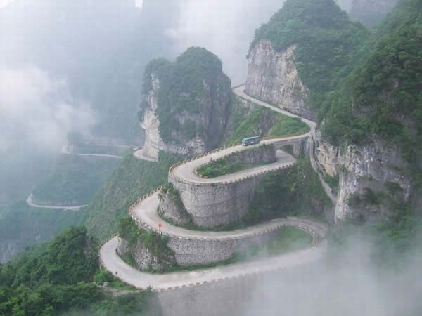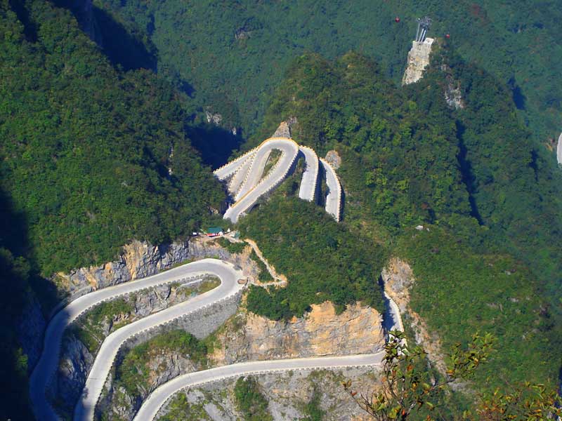 張家界天門山盤山公路有"通天大道"之稱,盤山公路全長10.77公里,海拔從200米急劇提升到1300米,大道兩側(cè)絕壁千仞,空谷幽深,共計99個彎,180度急彎此消彼長,似玉帶環(huán)繞,彎彎緊連,層層迭起,被譽為“天下第一公路奇觀”。