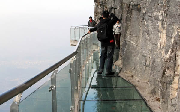 2011年10月1日,張家界天門山國家森林公園新建的玻璃棧道正式對游客開放。玻璃棧道懸于天門山頂西線,長60米,最高處海拔1430米。是張家界天門山景區(qū)繼懸于峭壁之上的鬼谷棧道、憑空伸出的玻璃眺望臺、從玻璃臺可以看見下面。玻璃臺伸出棧道有4-5米,專供游人拍照、橫跨峽谷的木質(zhì)吊橋后打造的又一試膽力作。為了讓游客零瑕疵的透過玻璃橋看到美麗的風(fēng)景,上橋的游客均要求戴上鞋套,以保持玻璃橋的透明和干凈。玻璃棧道的刺激震撼,可與舉世聞名的美國大峽谷玻璃走廊“天空之路”媲美,因而有了東方“天空之路”的美譽(yù)。