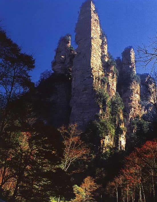 | 金鞭巖:過“閨門峰”沿溪而下約500米,有一座高約400米,孤標(biāo)直立,雄奇挺拔的奇峰,名金鞭巖。金鞭巖是武陵源著名景點(diǎn),峰體上細(xì)下粗,四棱分明。棱面布滿節(jié)理橫紋,形成鞭節(jié),渾如一根豎插大地的長(zhǎng)鞭。每當(dāng)夕陽晚照,鞭身涂金,熠熠閃光,瑰麗奪目,構(gòu)成一幅奇特壯美的“夕陽金鞭圖”。
