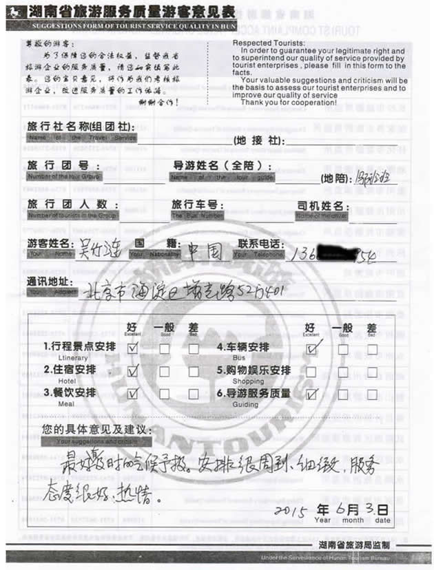 現(xiàn)在位置:首頁 -> 西部國旅->旅游質(zhì)量反饋 -> 2015-6-3 北京吳先生一行四位貴賓 張家界、楊家界三日游