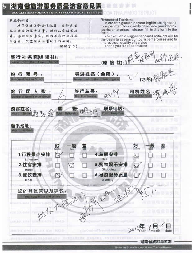 5月份,臺灣趙女士一行6位貴賓與湖南西部(張家界)中國國際旅行社工作人員——小龔取得聯(lián)系,經(jīng)過商談,雙方達(dá)成協(xié)議并簽訂旅游合同,于9月12日抵達(dá)張家界,開始張家界之旅。此次行程是由我社優(yōu)秀導(dǎo)游——張杰負(fù)責(zé)旅游接待工作,張導(dǎo)在旅游過程中講解詳細(xì),客人也很滿意,在意見表上寫道:此次大陸之行、張家界之旅、很滿意。同時也感謝趙女士一行貴賓選擇湖南西部(張家界)中國國際旅行社,以及您對湖南西部國旅的信任與支持。我們會繼續(xù)努力,做好旅游接待工作。期待下一次與您的合作,祝您愉快!
