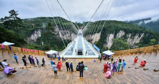 張家界大峽谷玻璃橋位于湖南省的張家界大峽谷景區(qū)栗樹埡和吳王坡區(qū)域內(nèi),為一座景觀橋梁,兼具景區(qū)行人通行、游覽、蹦極、溜索、T臺(tái)等功能。主跨430米,一跨過峽谷,橋面長375米,寬6米,橋面距谷底相對(duì)高度約300米。這座全透明玻璃橋長度、高度位居世界第一玻璃橋建成后,將成為世界首座斜拉式高山峽谷玻璃橋;并創(chuàng)下世界最高最長玻璃橋、首次使用新型復(fù)合材料建造橋梁等多項(xiàng)世界之最。