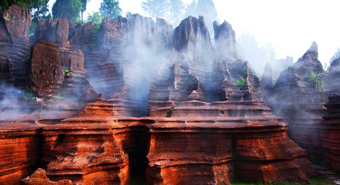 走進(jìn)古丈紅石林國家地質(zhì)公園,就如同走進(jìn)了一個夢幻般的世界,成柱成片的紅色石林、石崖、石墻、石峰,分布在群山峻嶺之中。石林造型千姿百態(tài),有的象總統(tǒng)頭像,巨人屹立,有的如神龜探海,鷹擊長空;有的像紫荊花怒放,海洋冰床,有的像城堡峰塔,大廈高樓,有的如樓蘭古城、駝鈴聲聲,有的像乳燕待哺、蝸牛搬家、有的如七彩迷宮、利劍刺空;有的像航母巡游、石兵列陣;有的如少女出浴、觀音坐蓮;有的像石鞭候主、靈龜探海;有的如棕熊迎客、天狗吠日;有的如水獺望云、母雞搗窩……尤以“大地劇場”、“巨人園”、“古城故宮”為奇石絕景中的最佳。